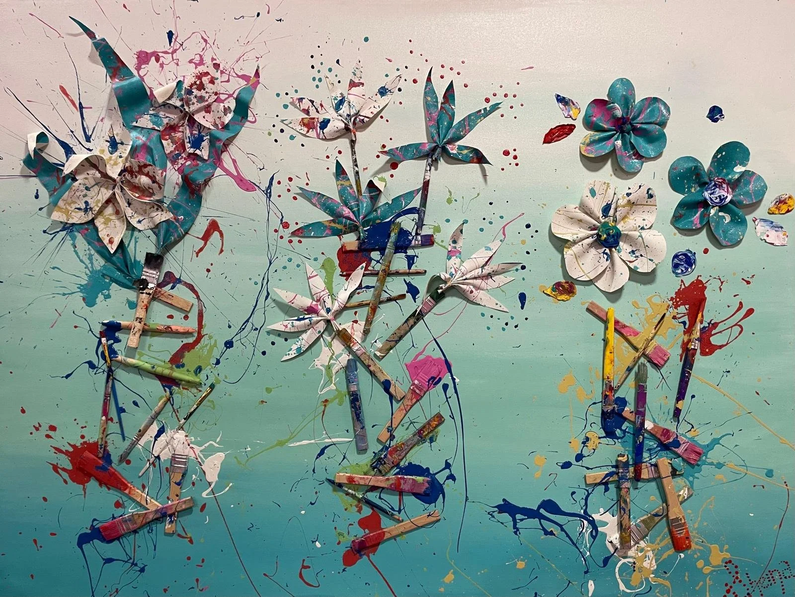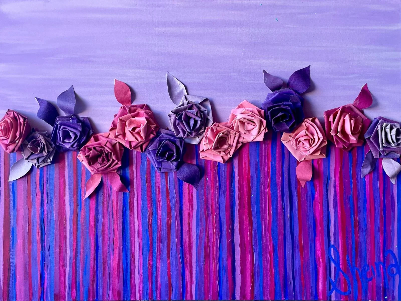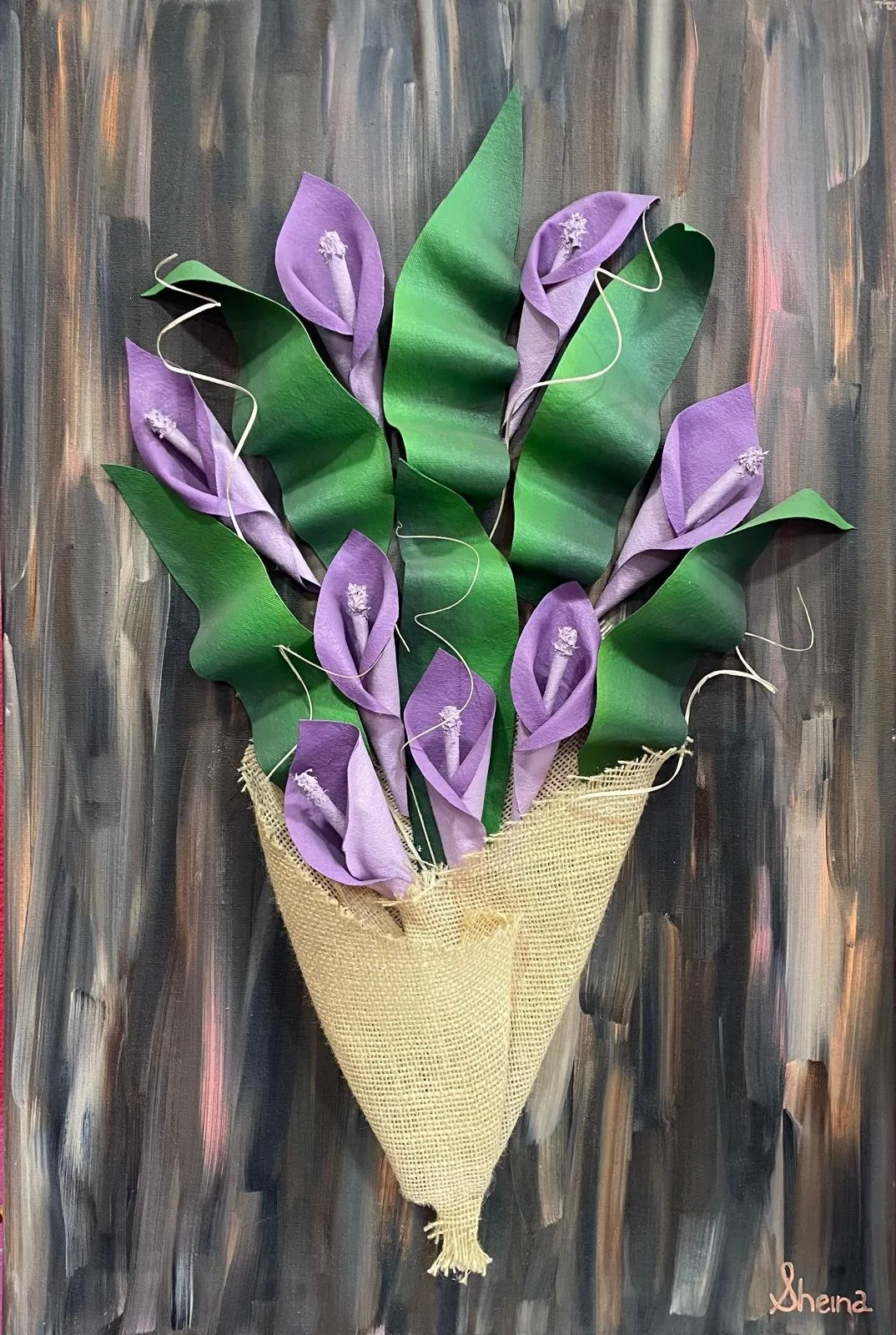 Sheina’s floral wall pieces, blur the line between painting and sculpture, combining raised petals, textured vessels, and gesturally painted grounds to create richly dimensional statements. Each piece is crafted from loose canvas, which she folds and shapes into exquisite blooms, surrounded by carefully manipulated materials that enhance their depth and elegance.